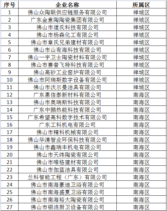 7月11日,佛山市工业和信息化局公布了2022年佛山市专精特新企业名单。按照公开、公平、公正的原则,经过企业主动申报、专家组评审、公示等程序,佛山市工业和信息化局认定认定佛山众陶联供应链服务有限公司等1100家企业为2022年佛山市专精特新企业,有效期三年。 其中,广东金意陶陶瓷集团有限公司、佛山市道氏科技有限公司、佛山市杨森化工有限公司、佛山市山有海科技有限公司、广东中鹏热能科技有限公司、佛山华清智业环保科技有限公司、佛山蓝动力智能科技有限公司、广东工科机电有限公司、佛山市蓝之鲸科技有限公司、佛山市利德嘉陶瓷制釉有限公司、佛山高明顺成陶瓷有限公司、广东丰霖新材料科技有限公司、佛山市华力达材料科技有限公司、佛山市迈瑞思科技有限公司、佛山市三水盈捷精密机械有限公司、佛山市德力泰科技有限公司、佛山市恒力泰机械有限公司、佛山市三水宏源陶瓷企业有限公司等我会会员企业及相关陶瓷、卫浴配套企业上榜。(相关名单整理如下): 2022年佛山市专精特新企业名单(部分名单)